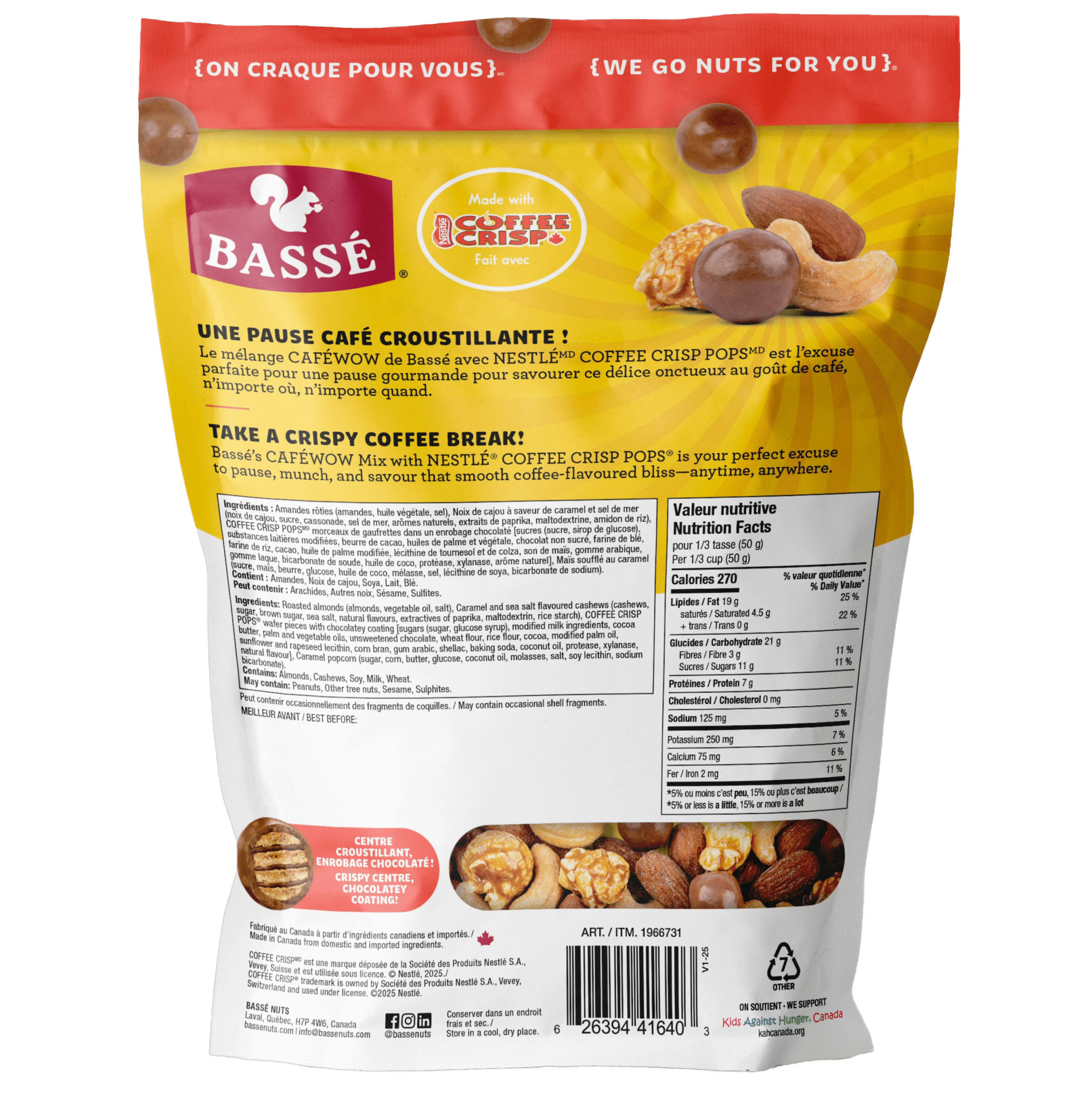 Ingrédients: Amandes rôties (amandes, huile végétale, sel), Noix de cajou à saveur de caramel et sel de mer (noix de cajou, sucre, cassonade, sel de mer, arômes naturels, extraits de paprika, maltodextrine, amidon de riz), COFFEE CRISP POPSᴹᴰ Gauffres avec enrobage chocolaté [sucres (sucre, sirop de glucose), substances laitières modifiées, beurre de cacao, huiles de palme et végétale, chocolat non sucré, farine de blé, farine de riz, cacao, huile de palme modifiée, lécithine de tournesol et de colza, son de maïs, gomme arabique, gomme laque, bicarbonate de soude, huile de coco, protéase, xylanase, arôme naturel], Maïs soufflé au caramel (sucre, maïs, beurre, glucose, huile de coco, mélasse, sel, lécithine de soya, bicarbonate de sodium).