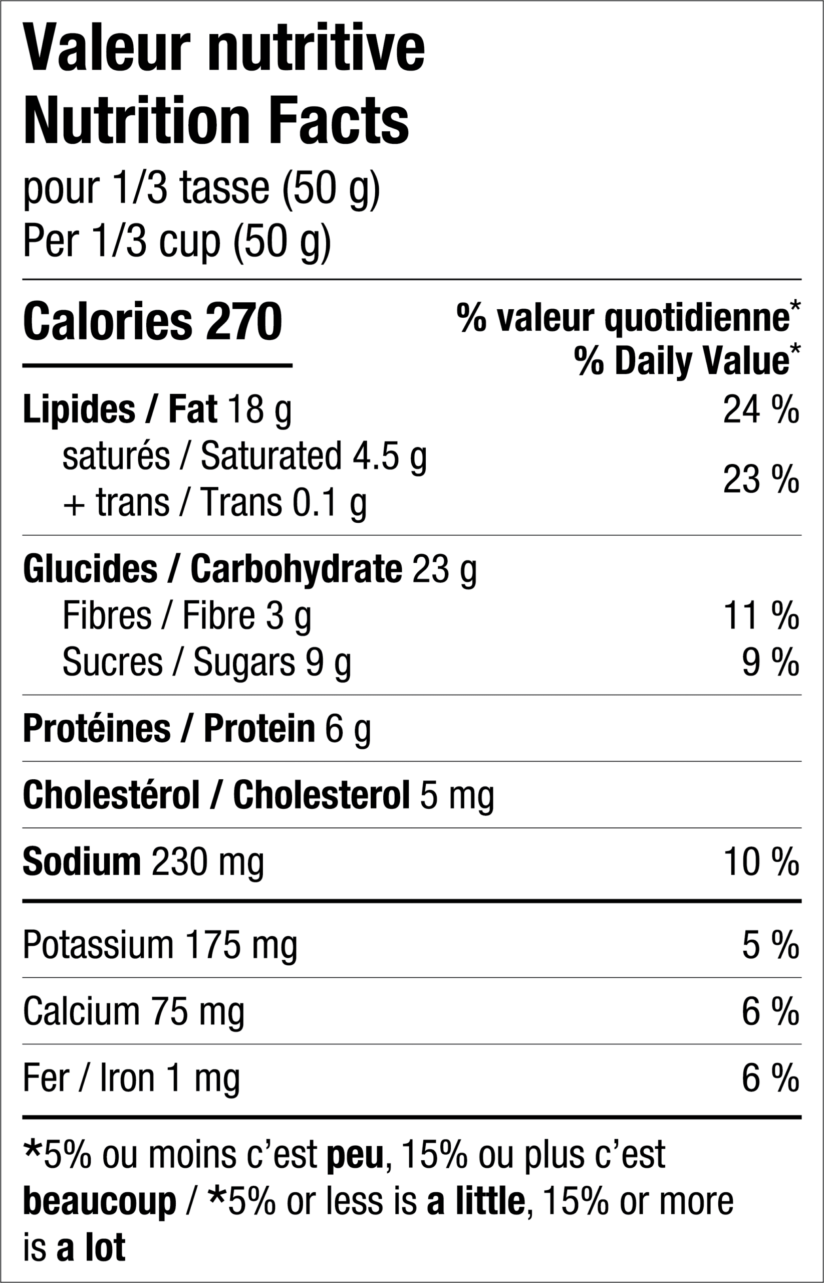 Contient : Amandes, Pacanes, Lait, Soya, Blé, Orge.
