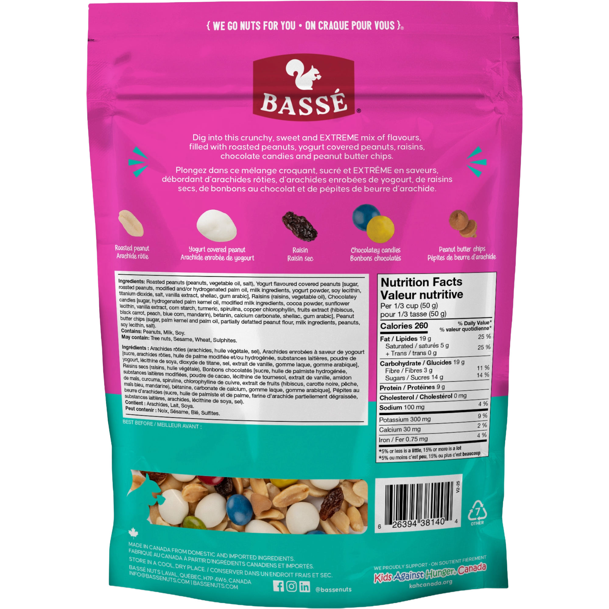 Bassé’s Extreme Mix is an indulgent blend of roasted peanuts, accompanied by the sweet flavour of yogurt covered peanuts, chocolate candies, and peanut butter chips. This mix can be enjoyed as snack or used to add crunch and flavour to a variety of baked goods.
