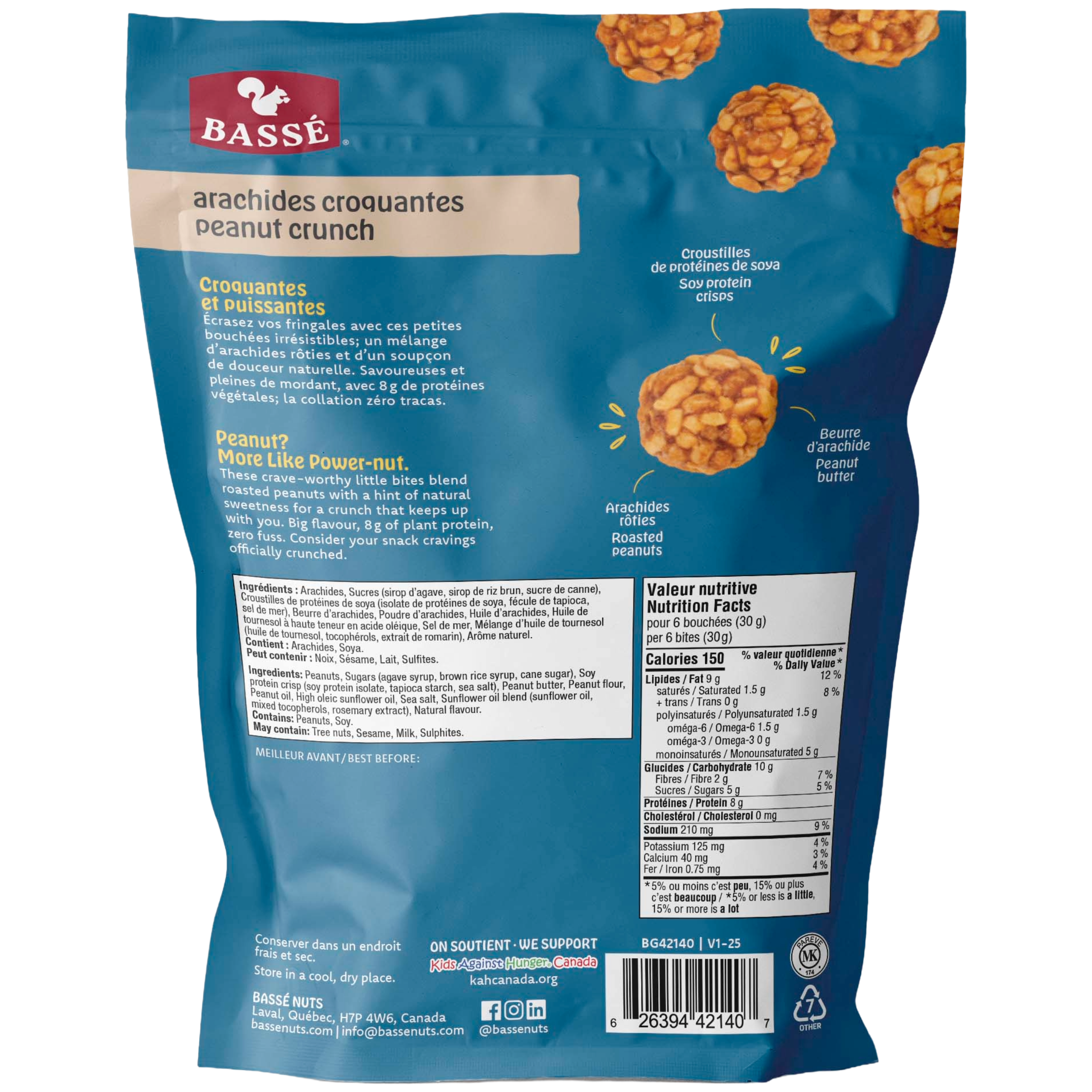 Ingredients: Peanuts, Sugars (agave syrup, brown rice syrup, cane sugar), Soy protein crisp (soy protein isolate, tapioca starch, sea salt), Peanut butter, Peanut flour, Peanut oil, High oleic sunflower oil, Sea salt, Sunflower oil blend (sunflower oil, mixed tocopherols, rosemary extract), Natural flavour.