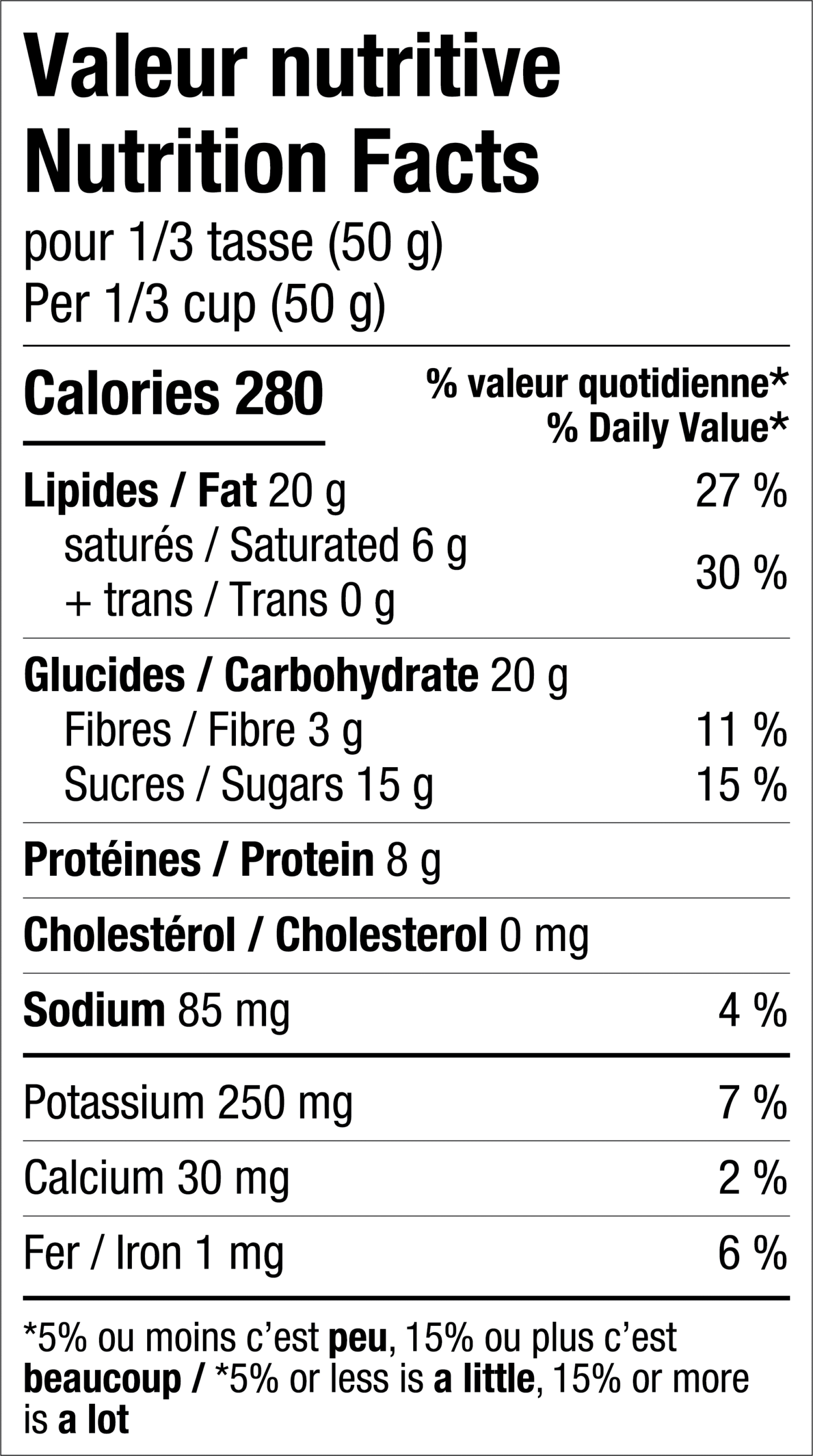 Ingredients: Roasted peanuts (peanuts, canola oil, salt), Praline peanuts (peanuts, icing sugar, glucose syrup, sugar, vegetable oil, soy lecithin, salt, gum arabic, shellac), Chocolate flavoured peanuts (roasted peanuts, sugar, hydrogenated palm kernel oil, cocoa powder, modified milk ingredients, unsweeneted chocolate, cocoa powder, soy lecithin, natural flavour, shellac, arabic gum), Dark chocolate flavoured chunks (sugar, modified palm kernel and/or palm oil, cocoa powder, soy lecithin, salt, natural flavours, natural vanilla extract, milk ingredients), Marshmallow flavoured chunks (sugar, modified palm kernel oil, hydrogenated palm oil, natural flavour, soy lecithin, vanilla extract, milk ingredients).