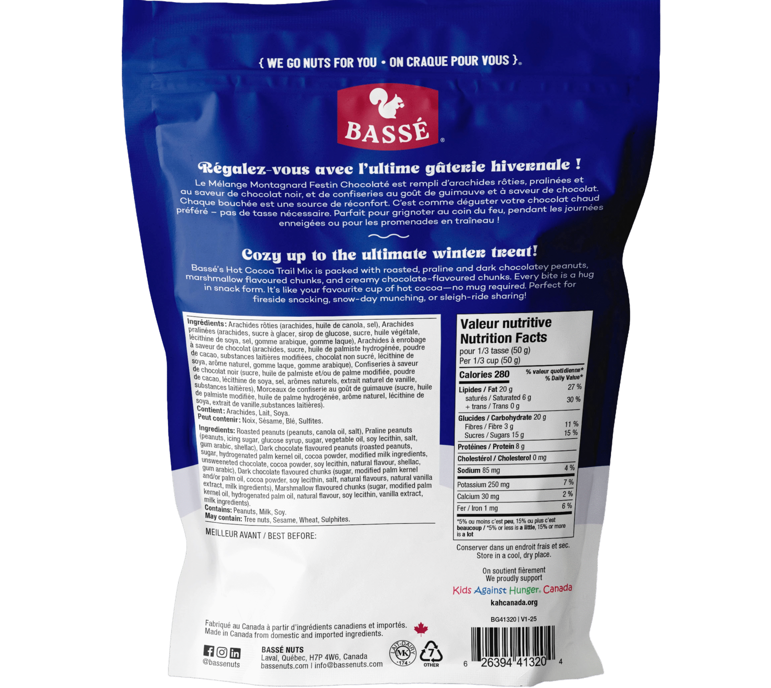 Bassé’s Hot Cocoa Trail Mix is packed with roasted, praline and dark chocolatey peanuts, marshmallow flavoured chunks, and creamy chocolate-flavoured chunks, ideal for snacking or entertaining during the holidays.