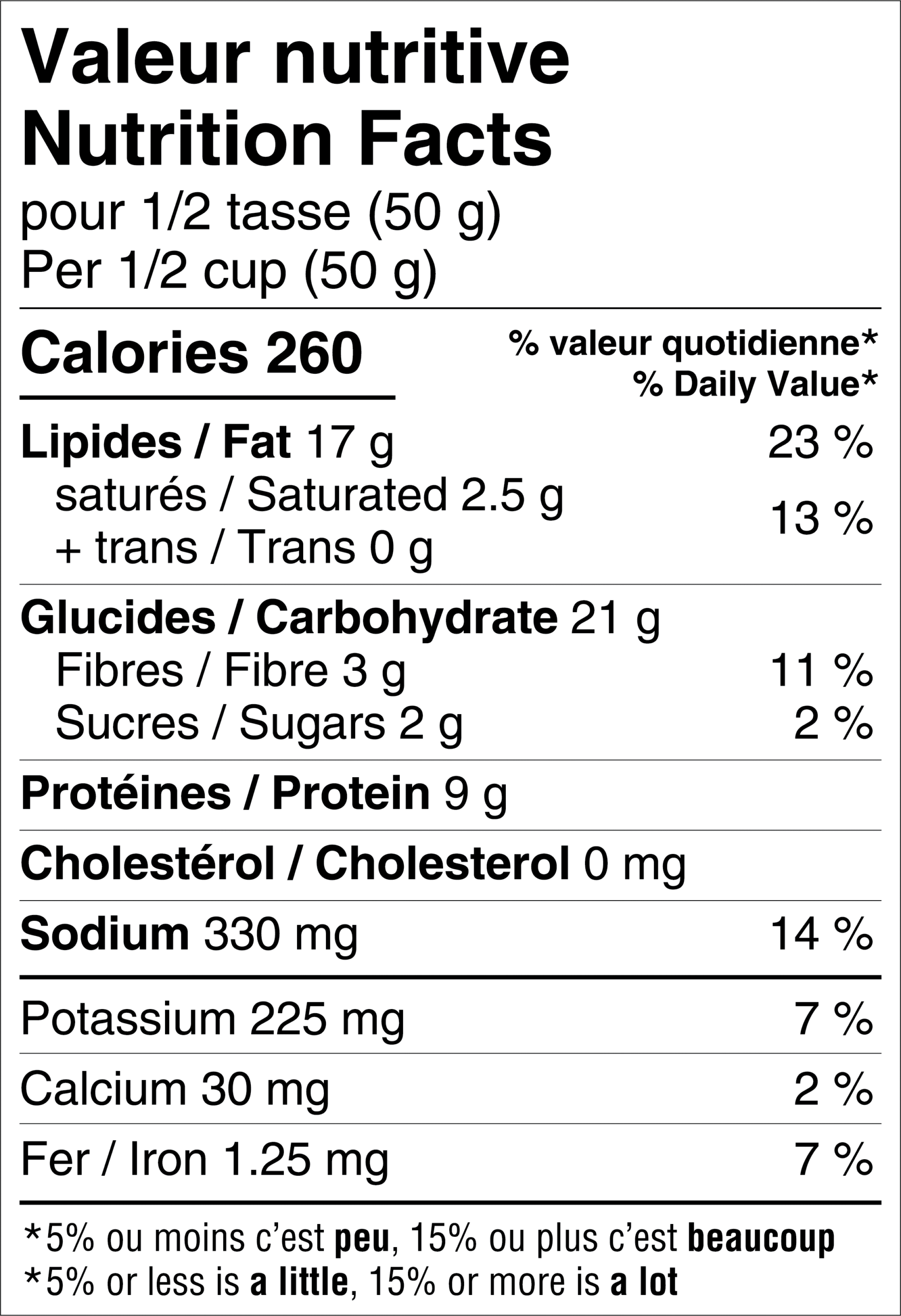 Ingredients: Roasted peanuts (peanuts, canola oil), Barbecue peanuts [peanuts, sugars (sugar, maltodextrin, brown sugar), salt, dehydrated vegetables (onion, tomato, garlic), yeast extract, spices, vegetable oil, smoke flavour, citric acid, flavour], Pretzels (wheat flour, salt, vegetable oil, corn syrup, barley malt syrup, yeast), Toasted corn (corn, salt, vegetable oil), Sesame sticks (enriched flour, soybean oil, sesame seeds, bulgur wheat, salt, beet powder, turmeric), Corn and flaxseed chips (corn, flax seeds, soybean oil, salt).