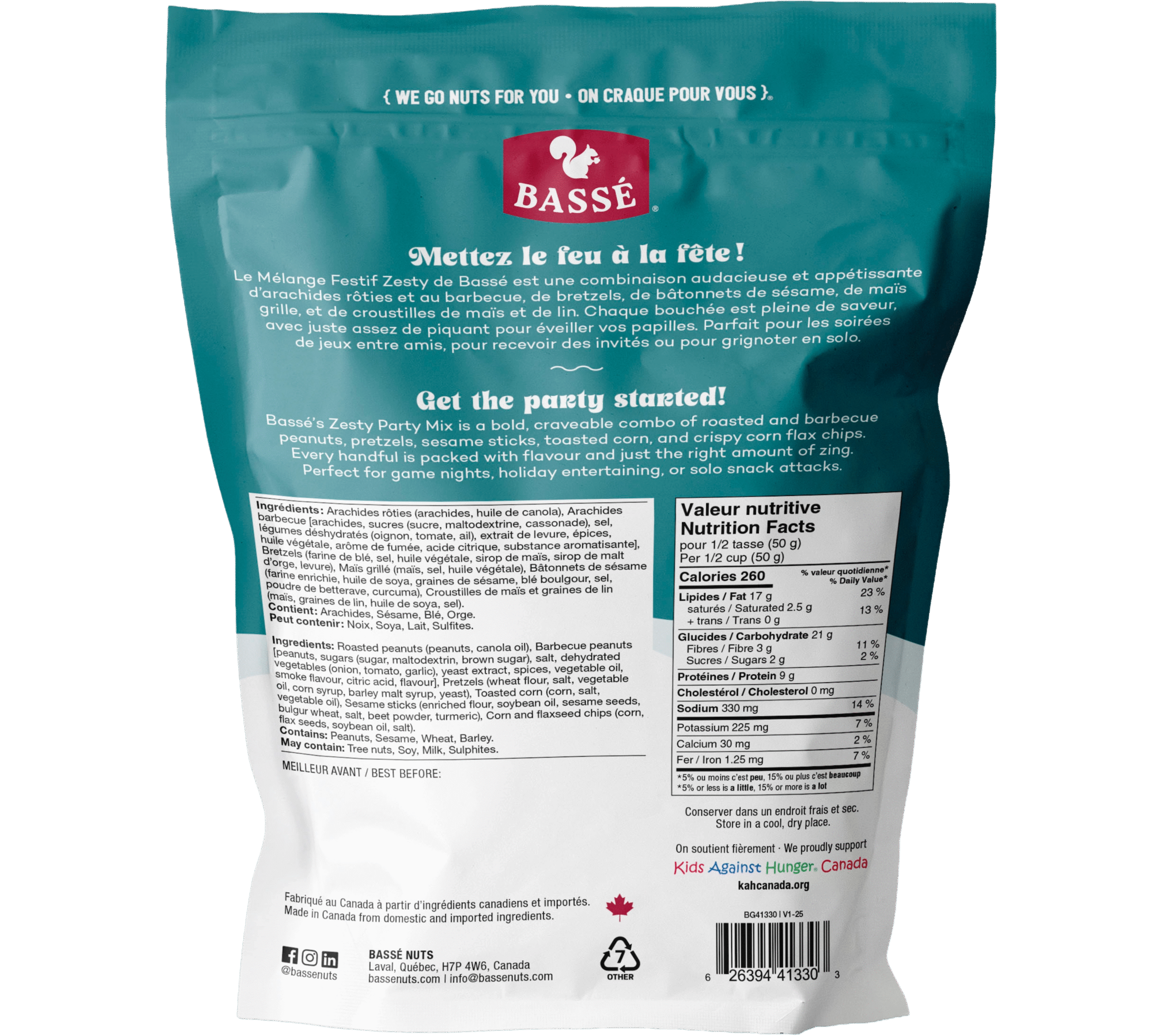 Bassé’s Zesty Party Mix is a bold, craveable combo of roasted and barbecue peanuts, pretzels, sesame sticks, toasted corn, and crispy corn flax chips, ideal for snacking or entertaining during the holidays.